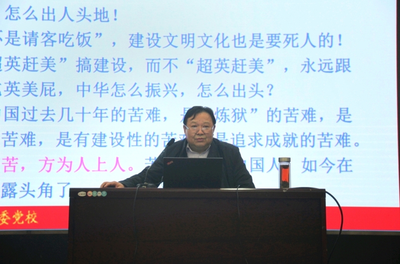 胡立新引用了梁启超的《少年中国说》,他指出,青年要化“小我”为 “大我”,要为人民办实事;以毛泽东同志和习近平主席的事例,勉励当代青年要树立正确的三观。他还为我们解读了台湾学者颜元叔的《中国的前途不在台湾在大陆》,他强调,作为一名共产党员,要带头吃苦带头创业,全心全意为人民服务。